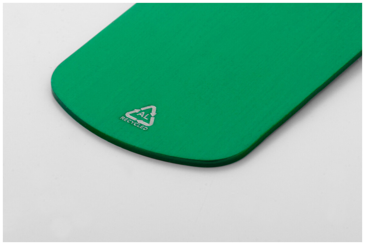 Přívěšek na klíče z recyklovaného hliníku s kovovým kroužkem.
