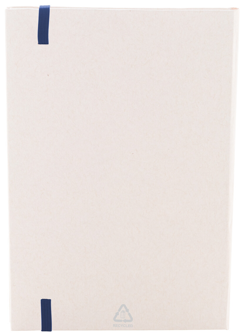 Blok A5 z kartonu z recyklovaného mléka s pevnou vazbou, 80 linkovanými listy a elastickým páskem v odpovídající barvě.