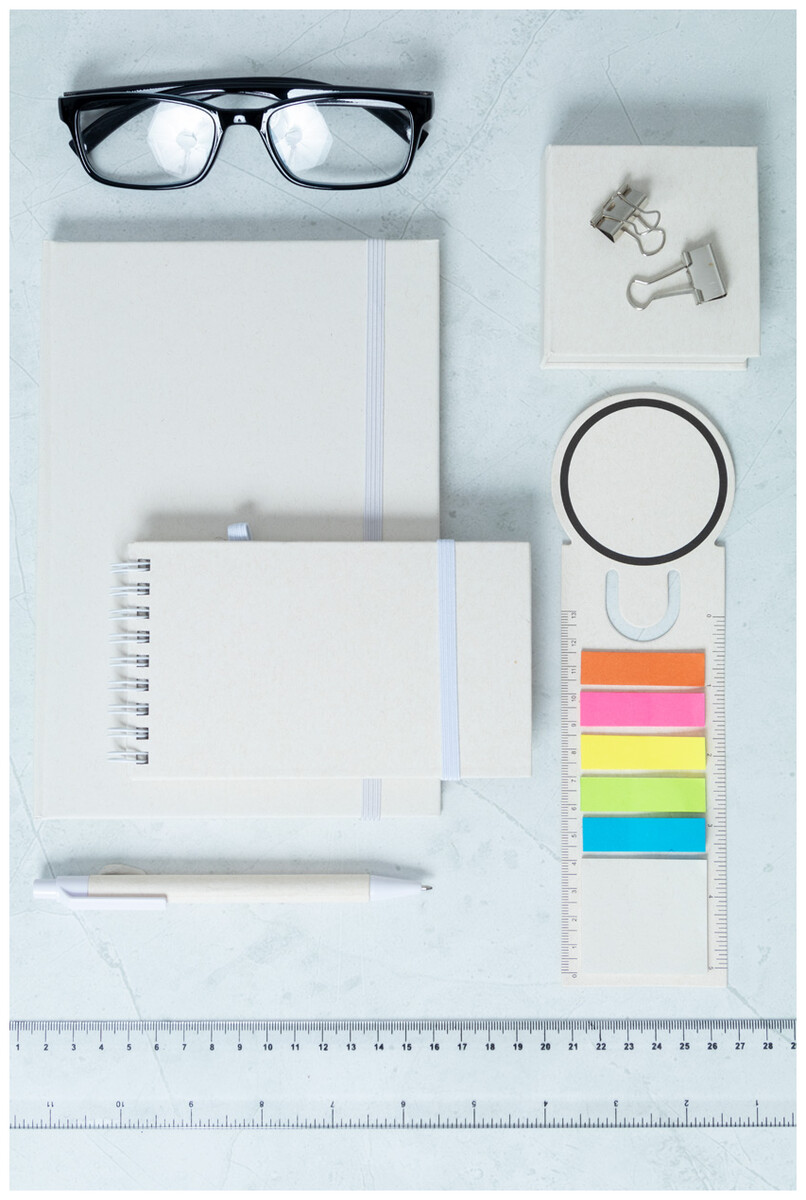 Spirálový blok A6 s deskami z recyklovaného z kartonu na mléko s pevnou vazbou a 70 linkovanými listy. Se spirálovými kroužky ve stejné barvě, gumičkou a poutkem na pero. Včetně recyklovaného kartonového papíru na mléko a recyklovaného ABS plastového kuličkového pera s modrou náplní.