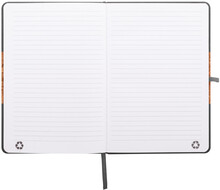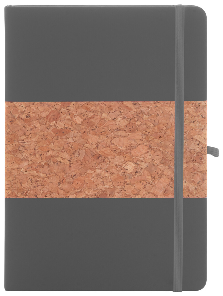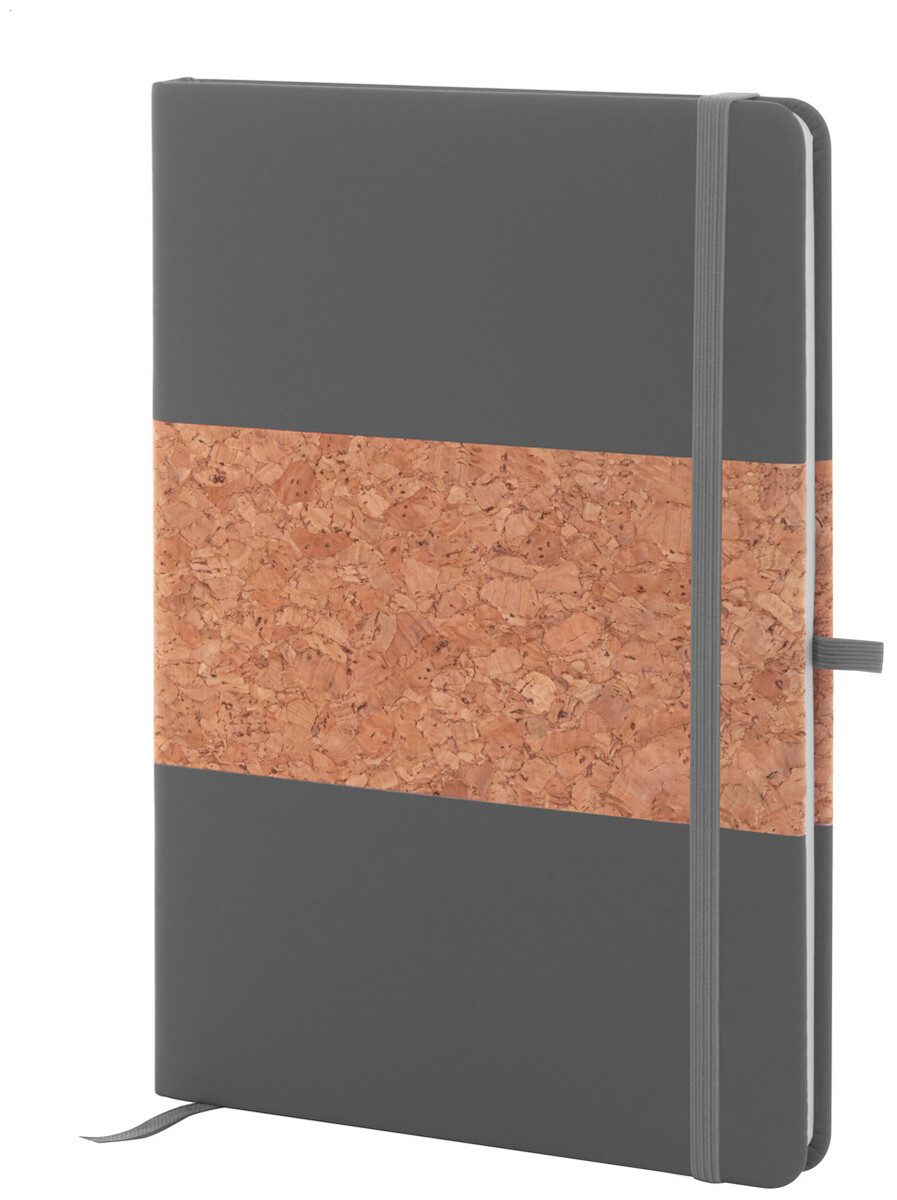 Blok A5 potažený přírodním korkem a recyklovanou PU kůží se záložkou v odpovídající barvě, gumičkou a držákem na pero. S 80 linkovanými listy z recyklovaného papíru.