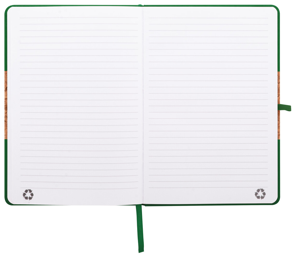 Blok A5 potažený přírodním korkem a recyklovanou PU kůží se záložkou v odpovídající barvě, gumičkou a držákem na pero. S 80 linkovanými listy z recyklovaného papíru.