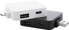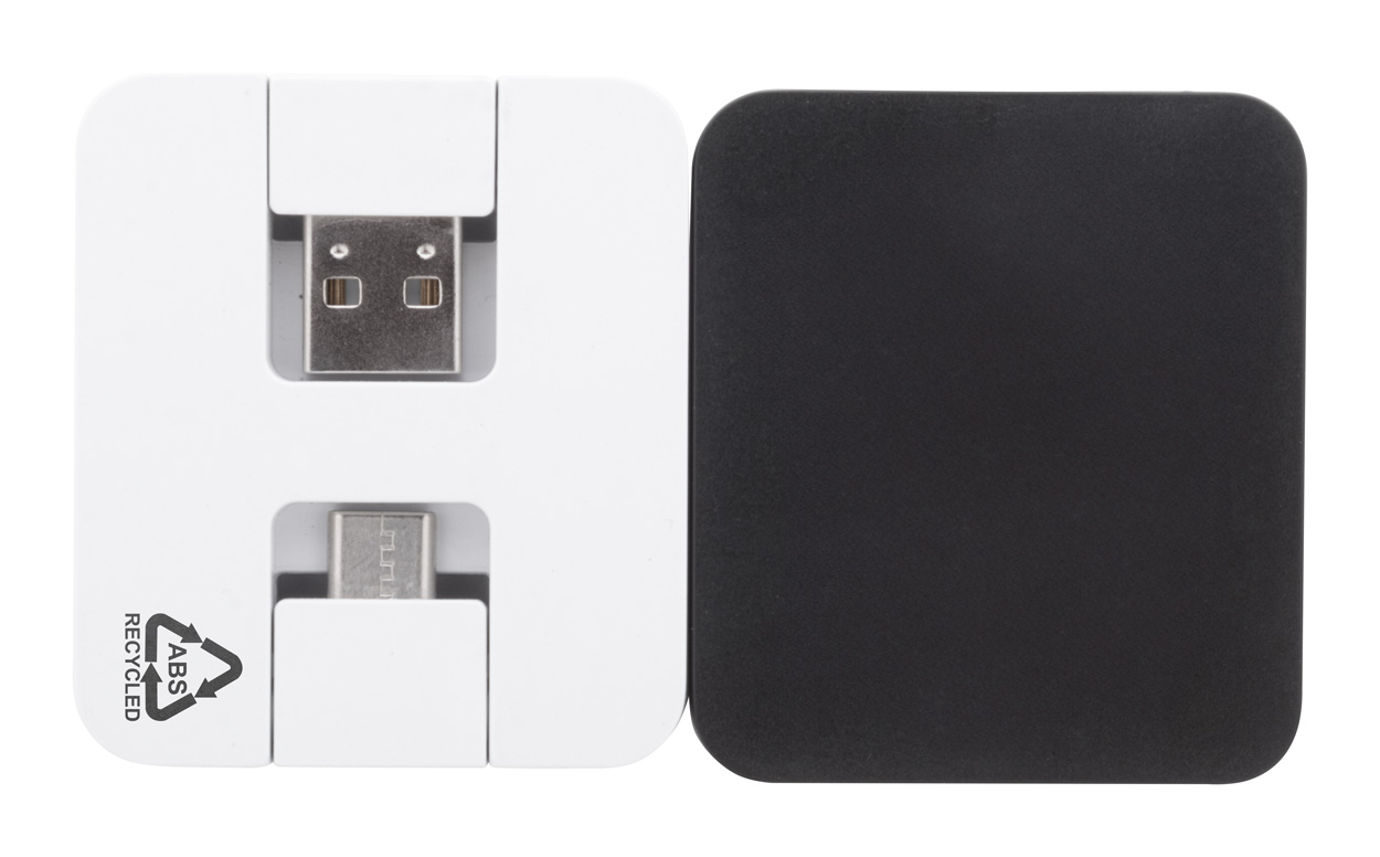 USB hub vyrobený z recyklovaného ABS plastu se 2 USB a 2 USB-C porty. Se sklopnými konektory USB a USB-C. USB 2.0.