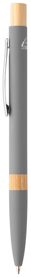 Kuličkové pero z recyklovaného hliníku s bambusovými částmi, pogumovaným povrchem a chromovým klipem. Se speciální vrstvou pro zrcadlové laserové gravírování. S modrou náplní.