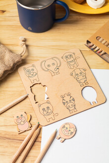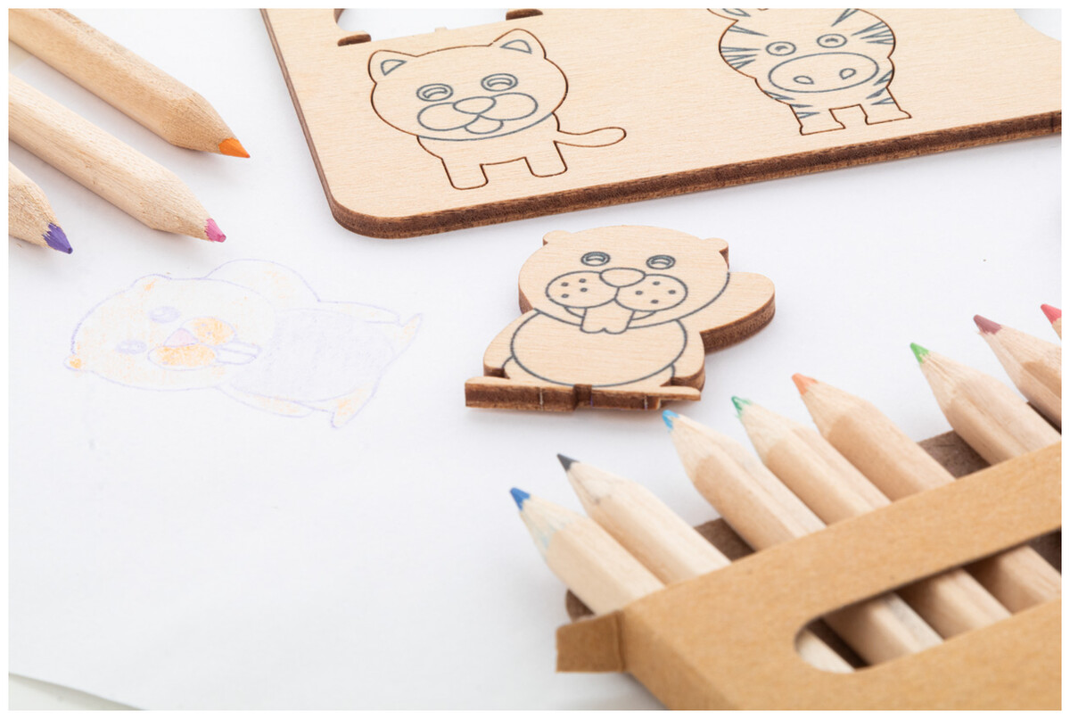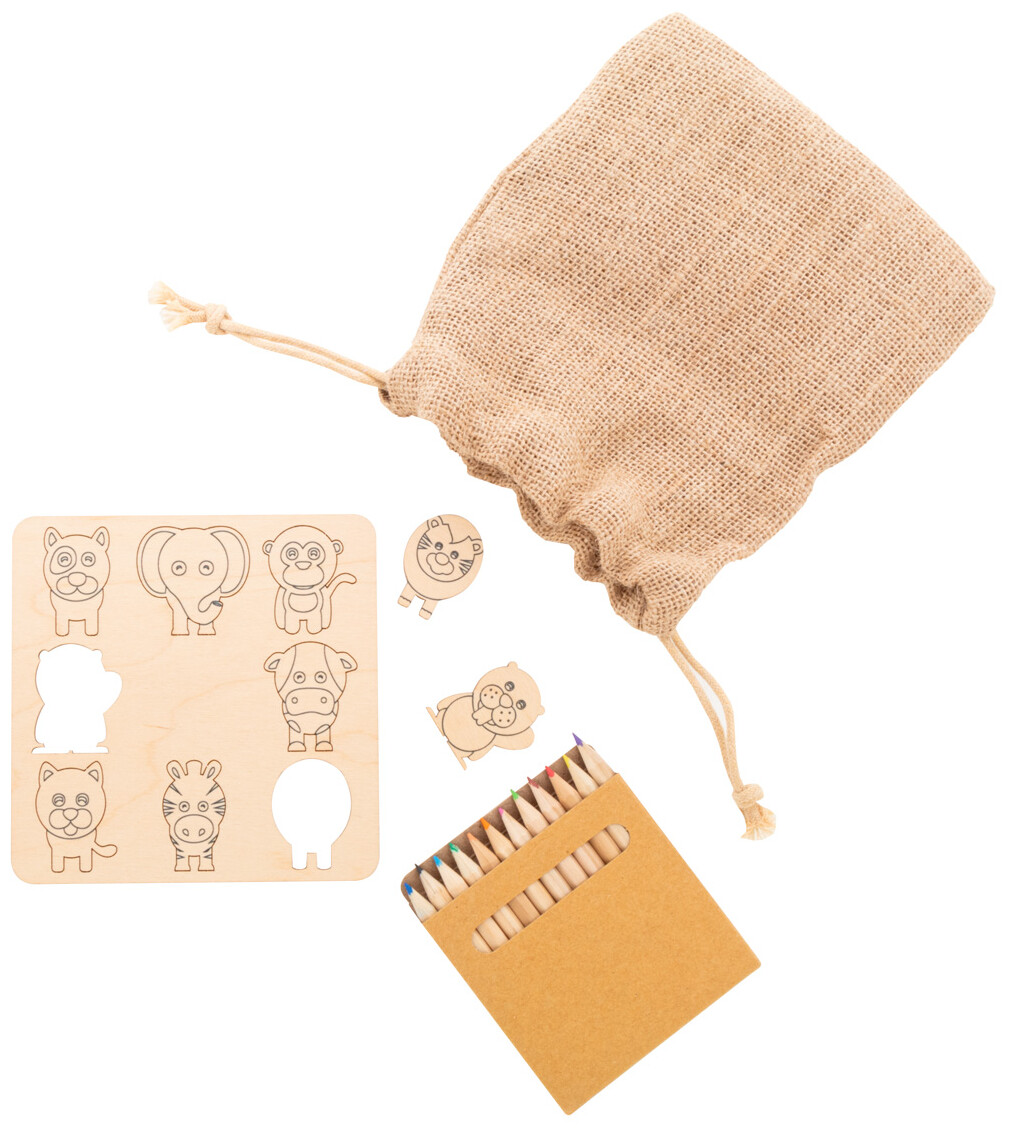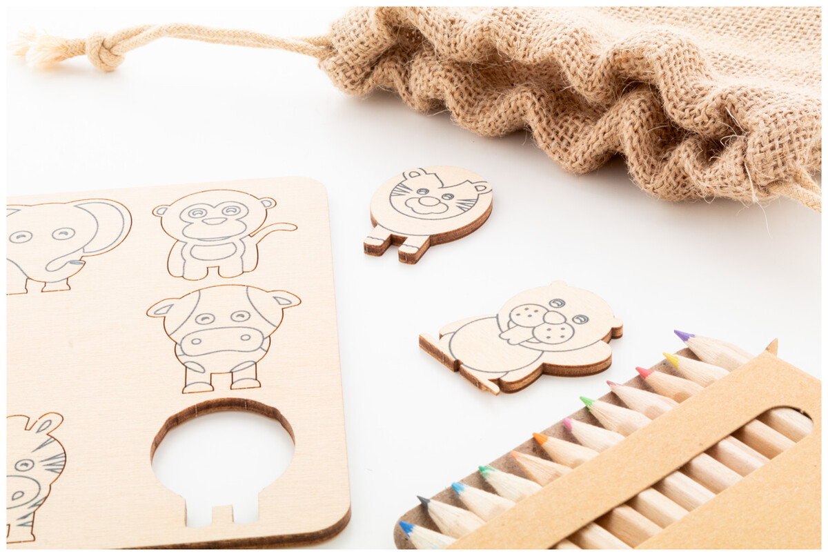 Vybarvovací hra z březové překližky s jutovým pouzdrem. Obsahuje tématické vyřezávané figurky (8 ks) a dřevěné barevné tužky (12 ks) v papírové krabičce.