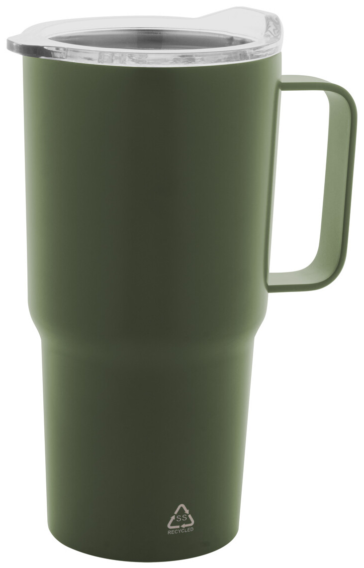 Dvoustěnný vakuově izolovaný termo hrnek z recyklované nerezové oceli s plastovým víčkem na pití z PS. 600 ml.