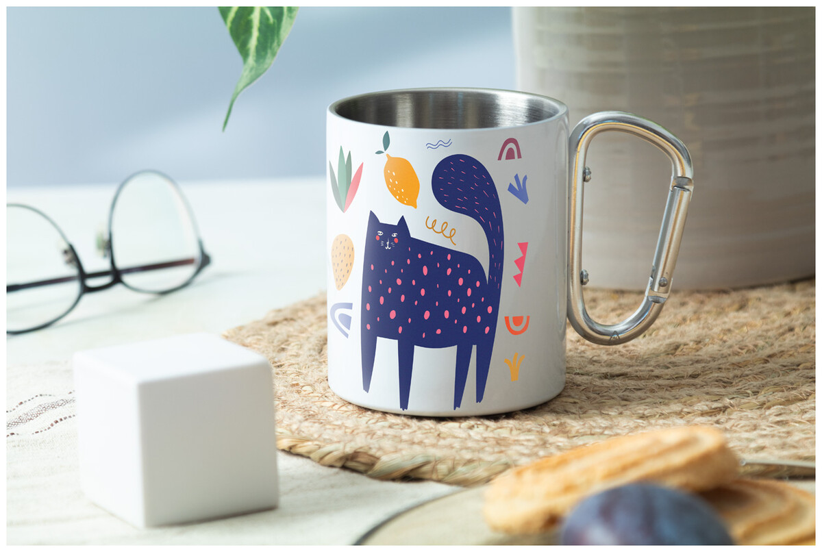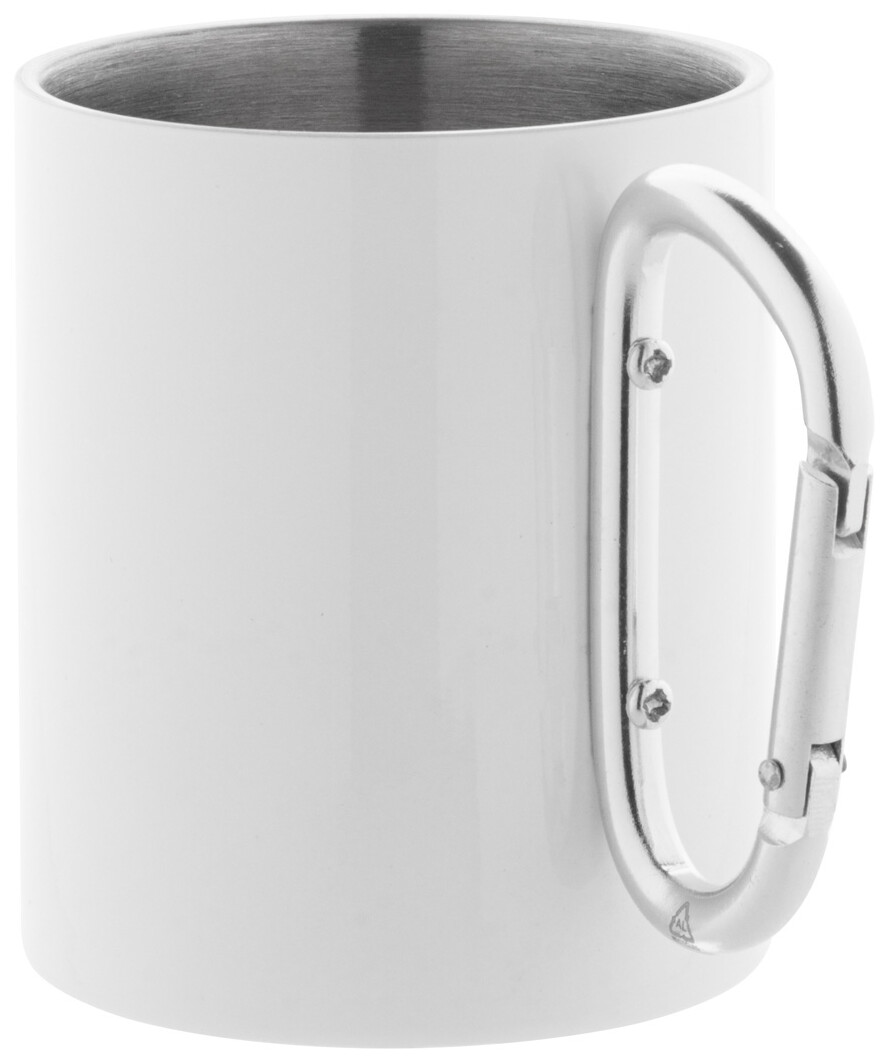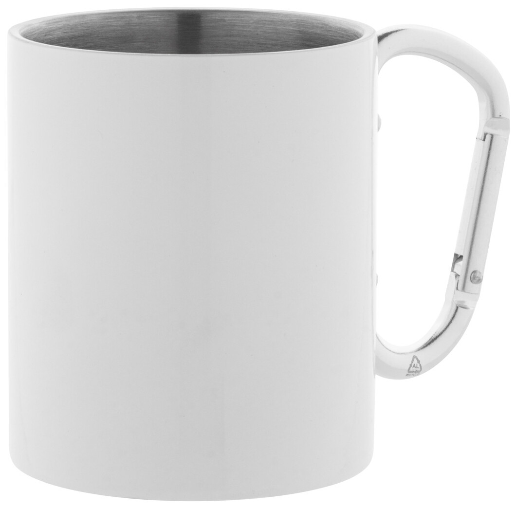Dvoustěnný termo hrnek na sublimaci z recyklované nerezové oceli s karabinou z recyklovaného hliníku. 300 ml. V kraftové papírové krabici.