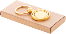 Kovový přívěšek na klíče ve zlatém provedení s otočnou vnitřní částí. V kraftové papírové krabici.