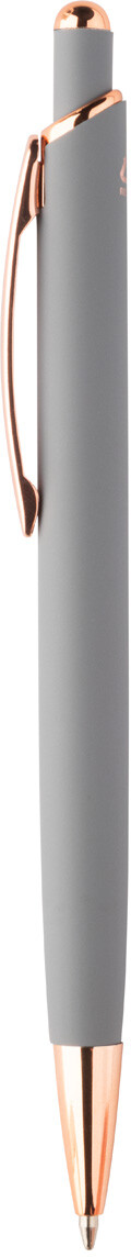 Kuličkové pero z recyklovaného hliníku s pogumovaným povrchem a detaily z růžového zlata. Se speciální povrchovou úpravou pro zrcadlové laserové gravírování v barvě růžového zlata. S modrou náplní.