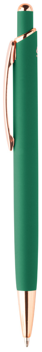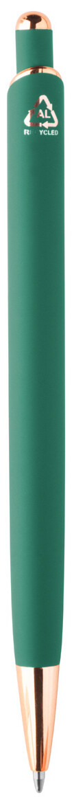Kuličkové pero z recyklovaného hliníku s pogumovaným povrchem a detaily z růžového zlata. Se speciální povrchovou úpravou pro zrcadlové laserové gravírování v barvě růžového zlata. S modrou náplní.