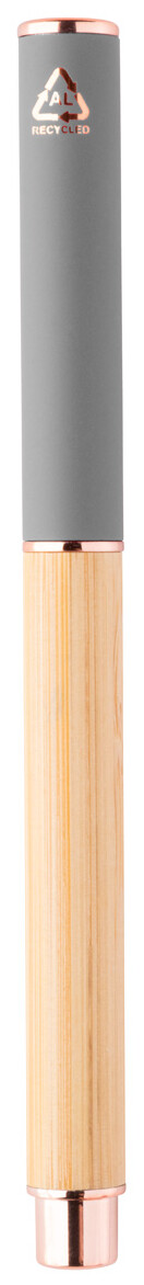 Roller pero z bambusu a recyklovaného hliníku s pogumovaným uzávěrem a detaily z růžového zlata. Se speciální povrchovou úpravou pro zrcadlové laserové gravírování v barvě růžového zlata. S modrou náplní.