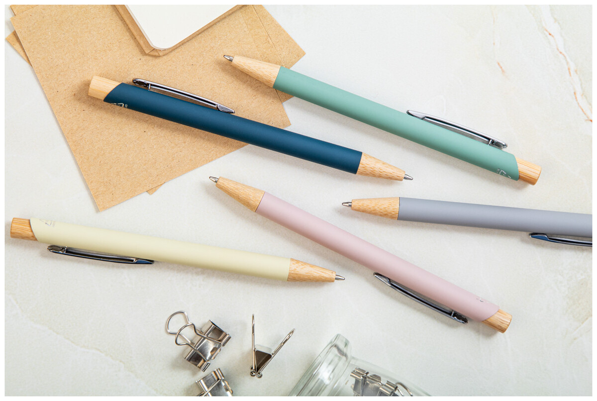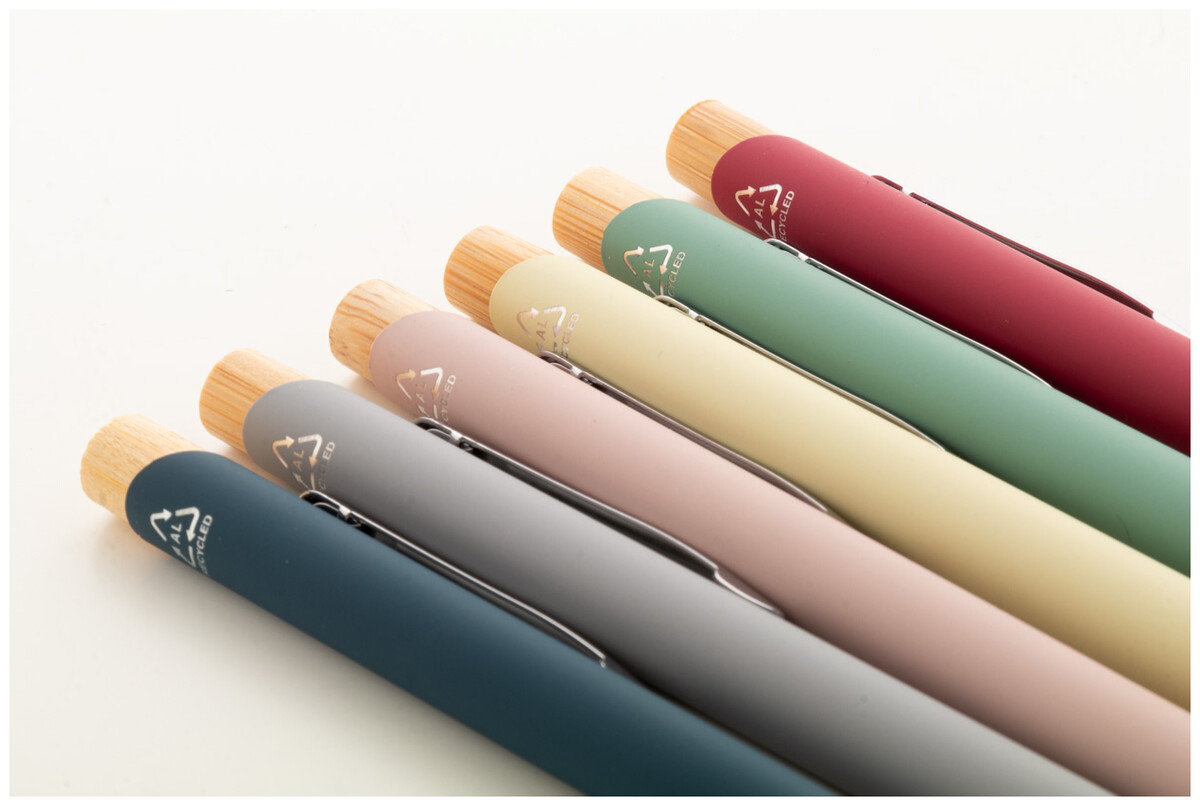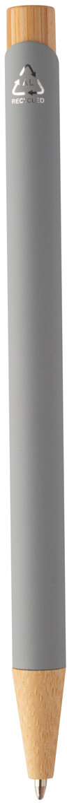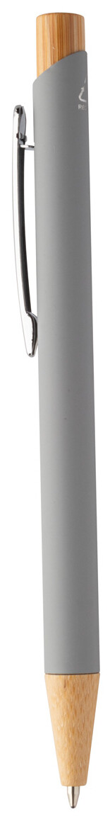 Kuličkové pero z recyklovaného hliníku s bambusovými částmi, pogumovaným povrchem a chromovým klipem. Se speciální vrstvou pro zrcadlové laserové gravírování. S modrou náplní.