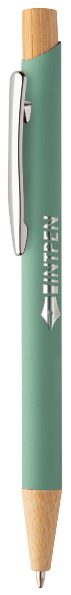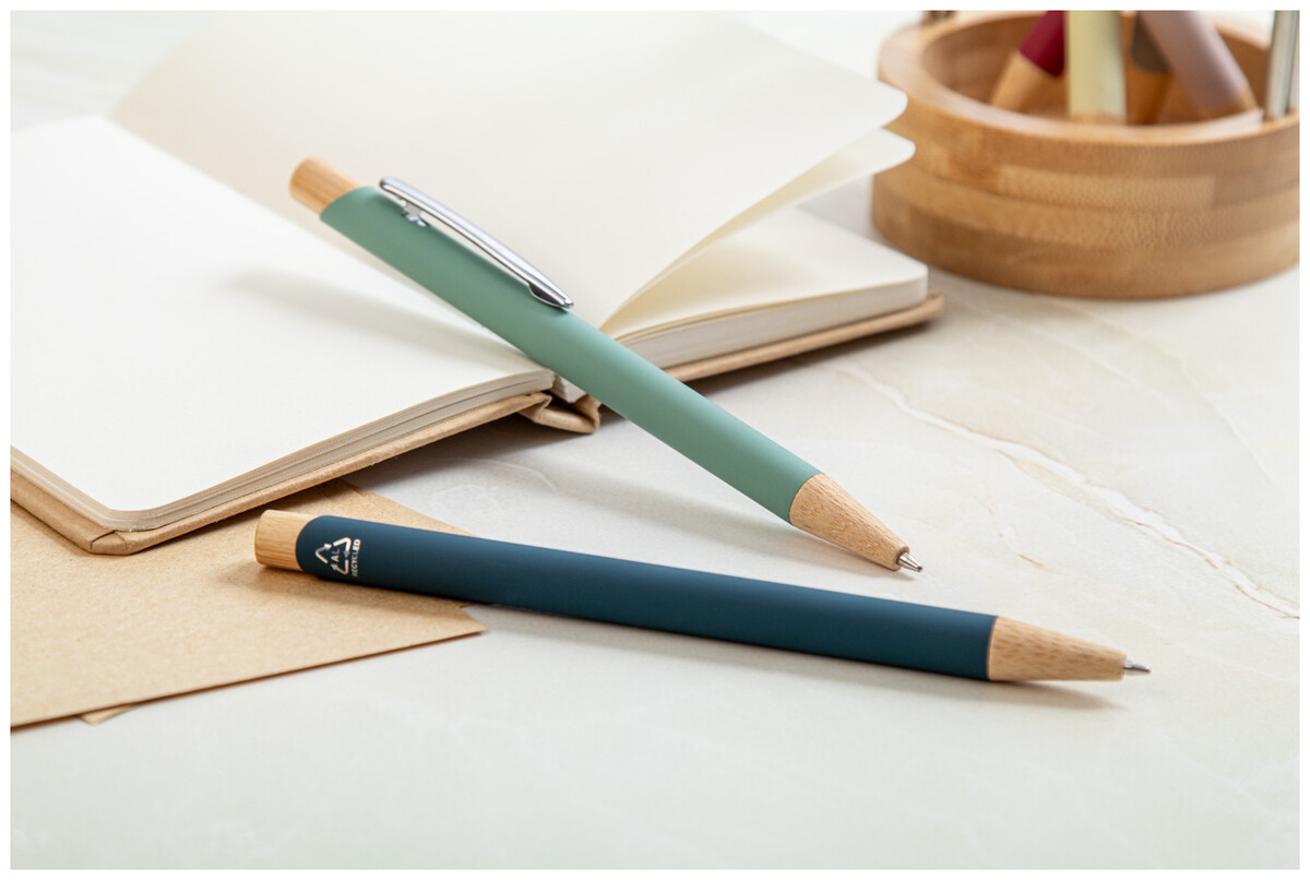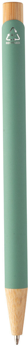 Kuličkové pero z recyklovaného hliníku s bambusovými částmi, pogumovaným povrchem a chromovým klipem. Se speciální vrstvou pro zrcadlové laserové gravírování. S modrou náplní.