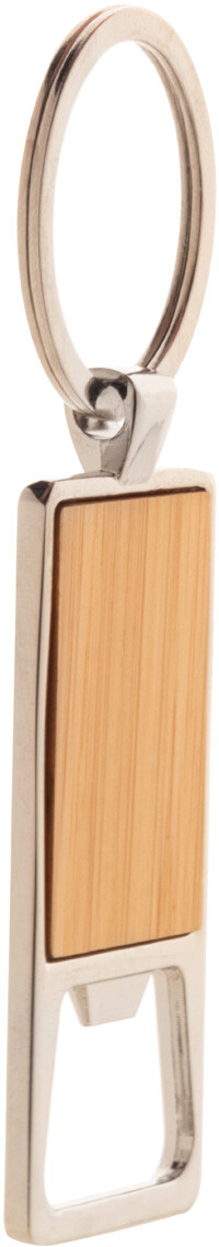 Kovový přívěsek na klíče s bambusovou vložkou a otvírákem na láhve.