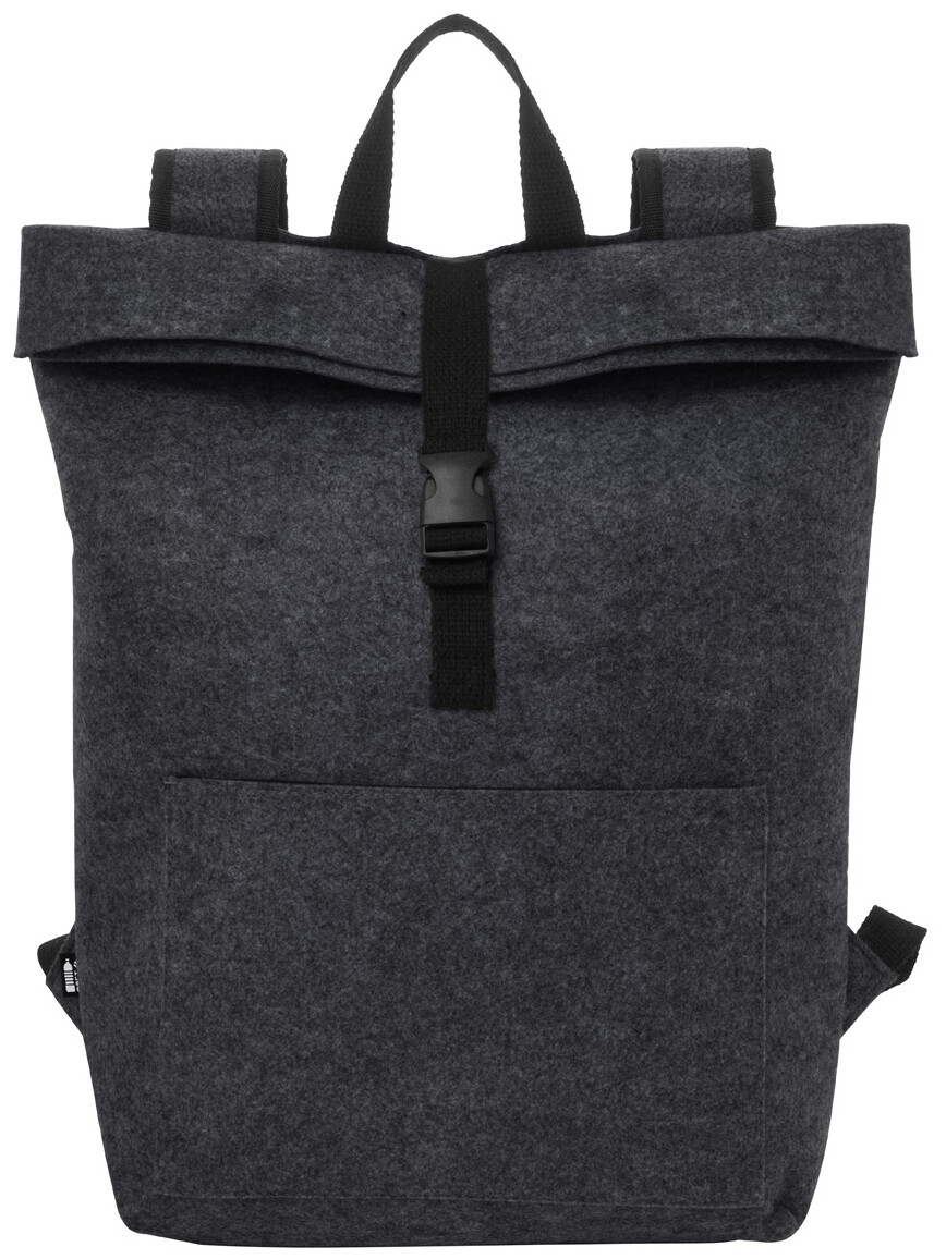 Batoh na rolování z plsti RPET s hlavní přihrádkou na přezku a přední kapsou na zip, přihrádkou na notebook (15") a polstrovanými ramenními popruhy. S výrazným štítkem RPET.