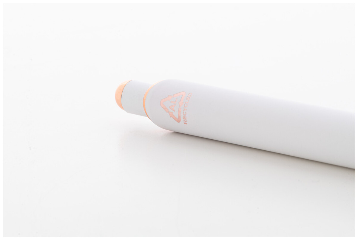 Kuličkové pero z recyklovaného hliníku s pogumovaným povrchem a detaily z růžového zlata. Se speciální povrchovou úpravou pro zrcadlové laserové gravírování v barvě růžového zlata. S modrou náplní.