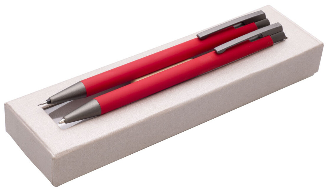 Dárková sada červené propisky a mikrotužky s pogumovaným povrchem a šedými doplňky v luxusním dárkovém pouzdru s průhledným okénkem.
