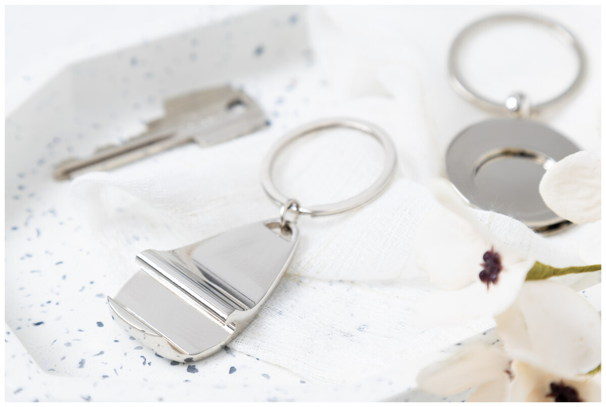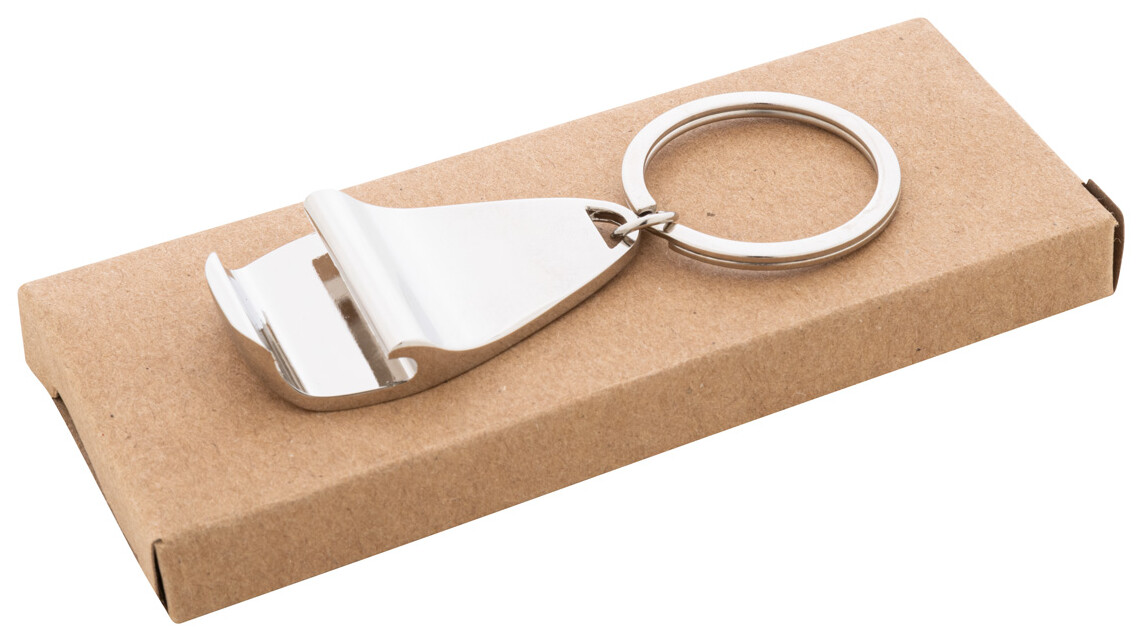 Kovový přívěšek na klíčer s otvírákem na láhve. V kraftové papírové krabičce.