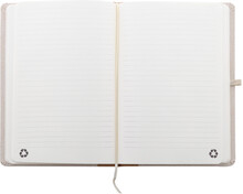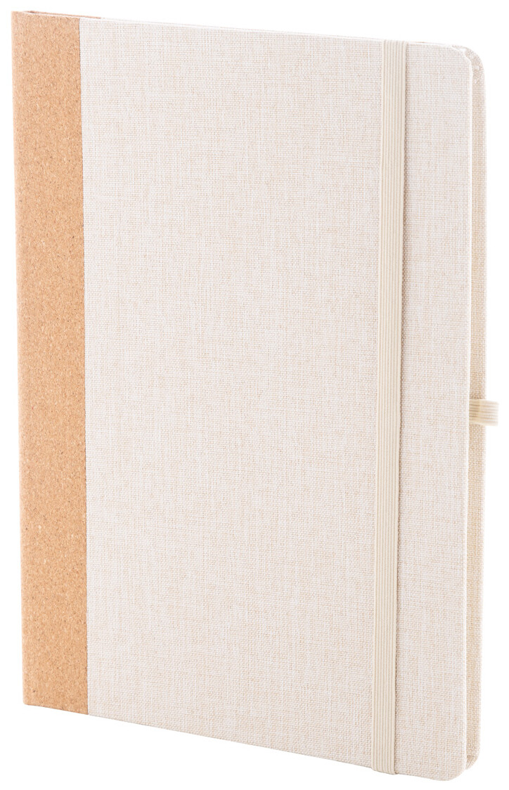 Blok A5 potažený polyesterem RPET s hřbetem z přírodního korku a 80 linkovanými listy z recyklovaného papíru. Se záložkou, gumovým páskem a držákem na pero.