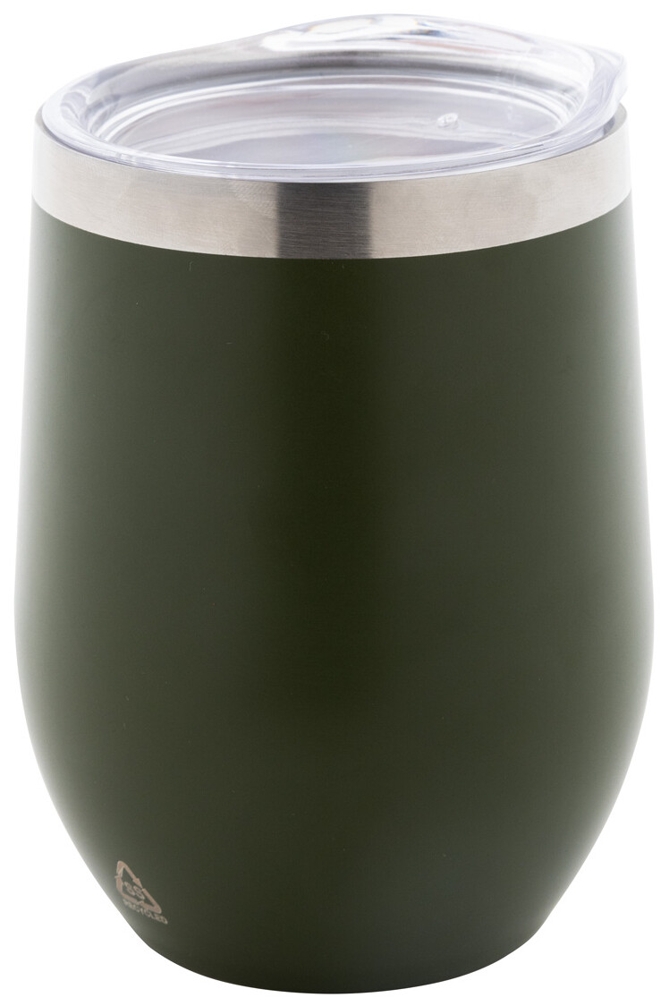 Dvoustěnný termo hrnek z recyklované nerezové oceli s plastovým víčkem na pití. 350 ml.