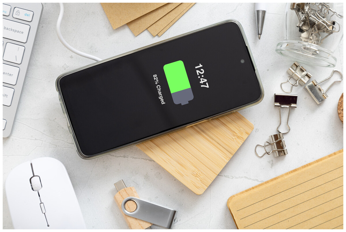 Bezdrátová rychlonabíječka (10W) v bambusovém pouzdře ve tvaru palety. Včetně USB nabíjecího kabelu.