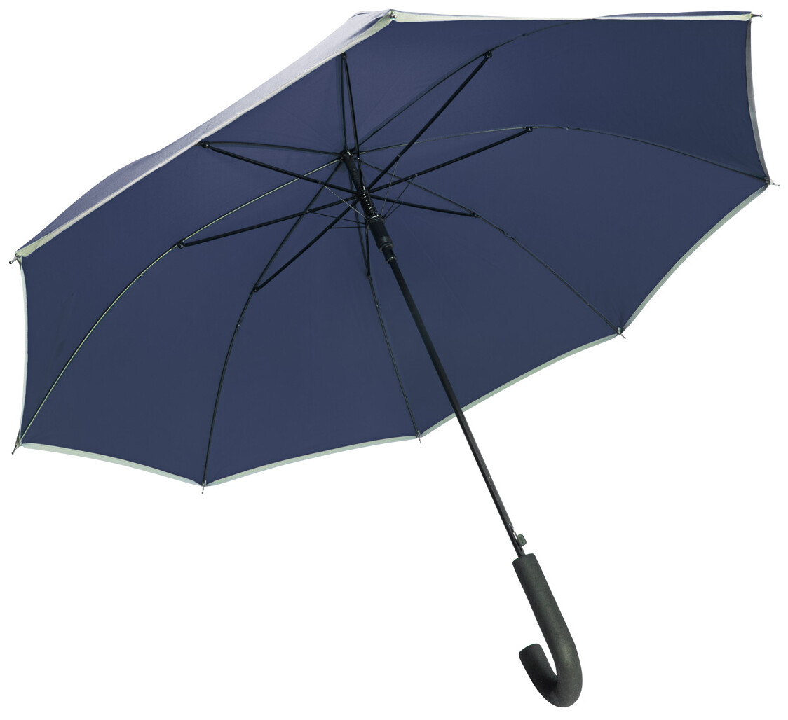Automatický, větruodolný deštník s 8 panely a reflexním lemem. S kovovým rámem, sklolaminátovými žebry a EVA rukojetí. Pongee 190T RPET. S výrazným štítkem RPET. Pouze pro propagační účely se produkt nekvalifikuje jako osobní ochranný prostředek.