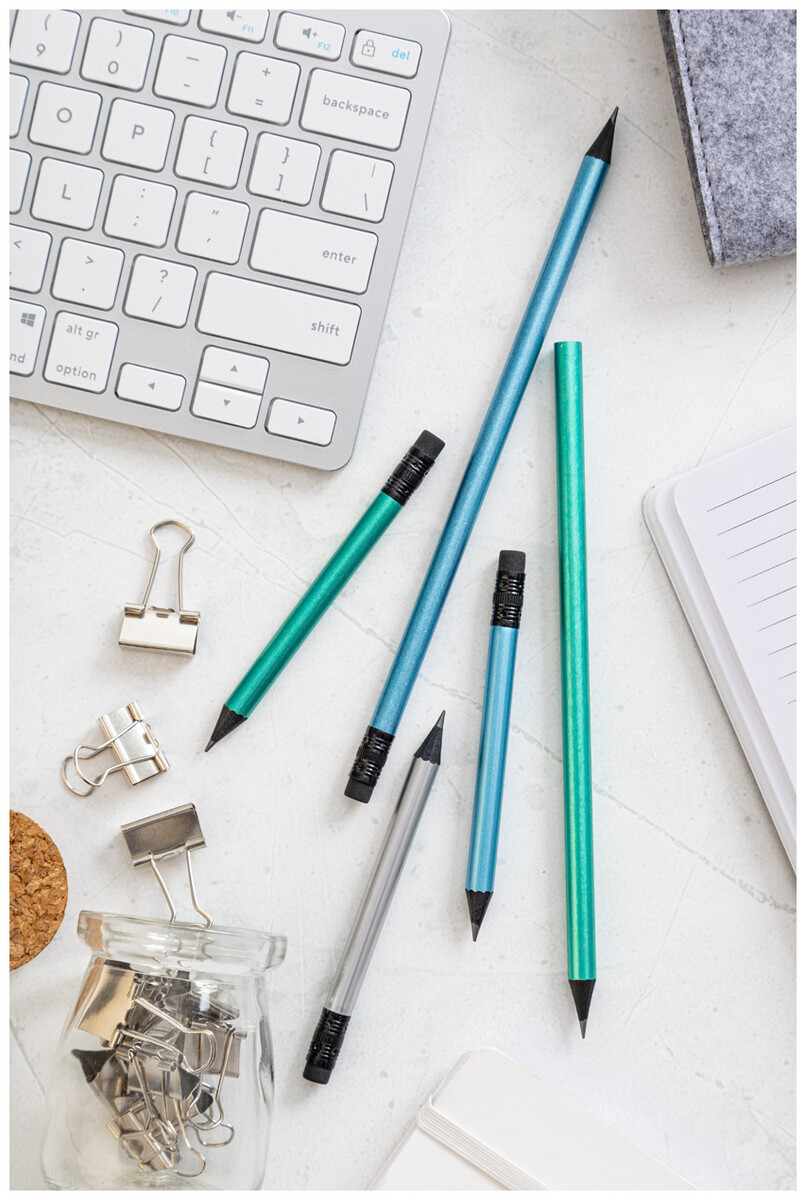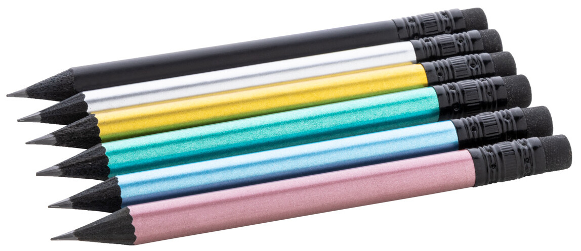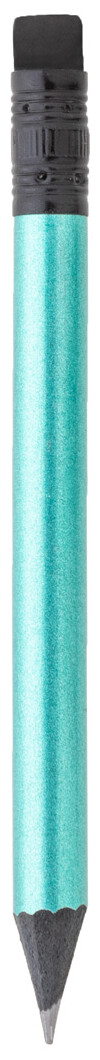 Černá dřevěná mini tužka v metalickém provedení s černou gumou. Ořezaná, třída HB.