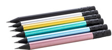 Černá dřevěná mini tužka v metalickém provedení s černou gumou. Ořezaná, třída HB.