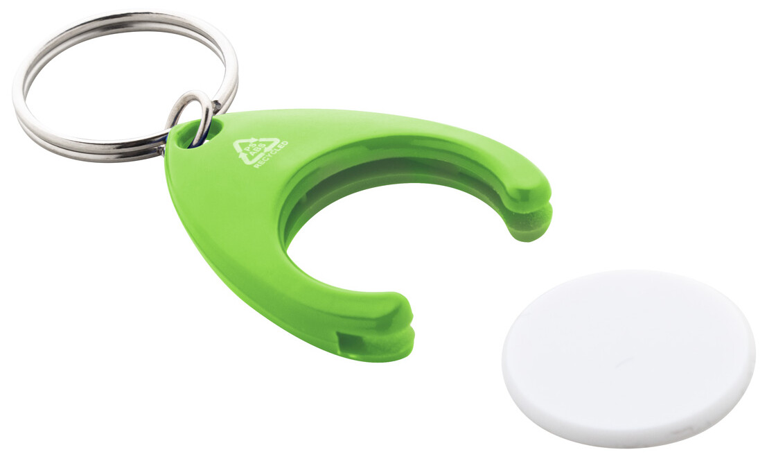 Přívěšek na klíče z recyklovaného ABS a recyklovaného plastu PS se žetonem do nákupního vozíku a kovovým kroužkem. Velikost mince: ø24×2 mm.