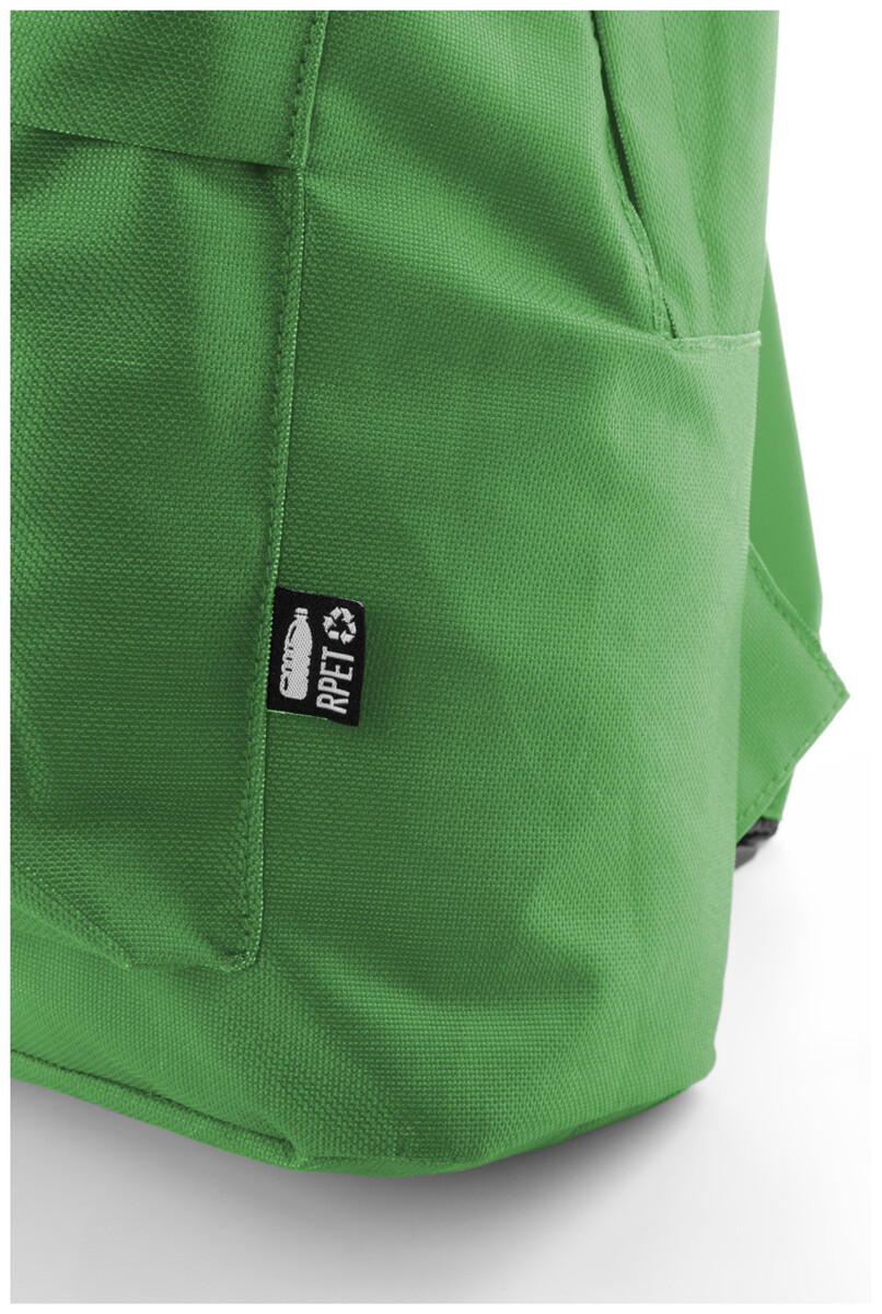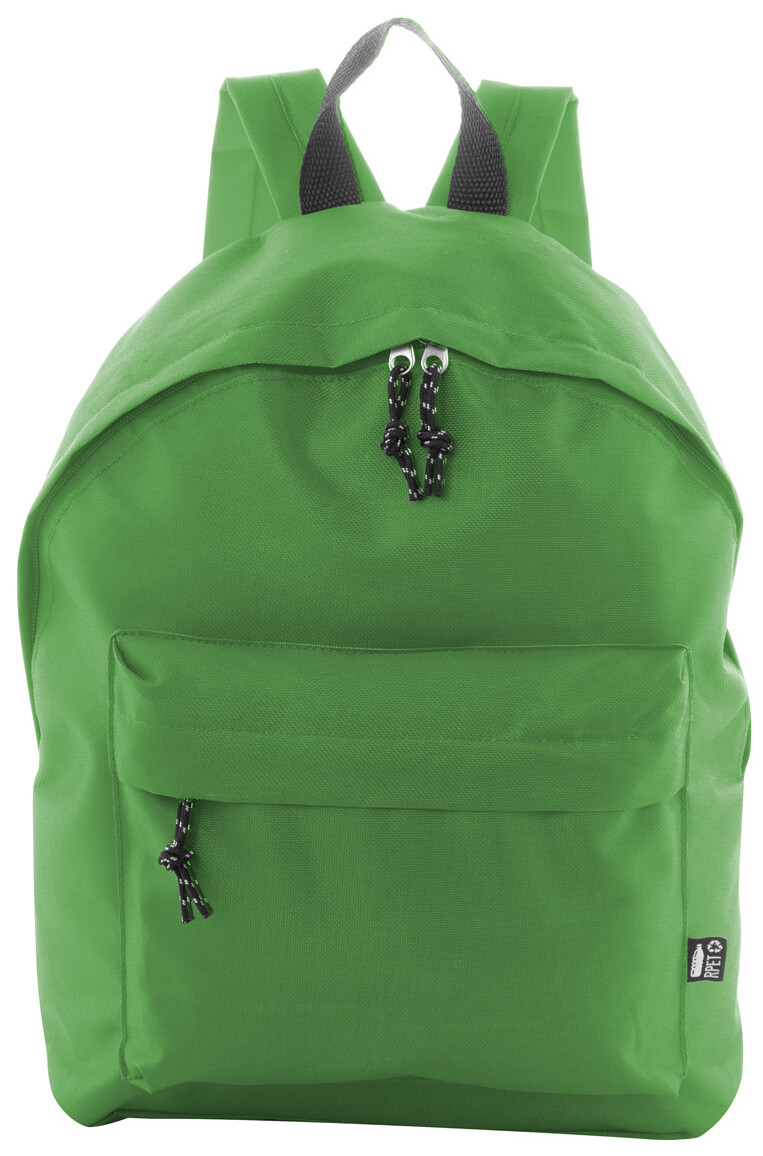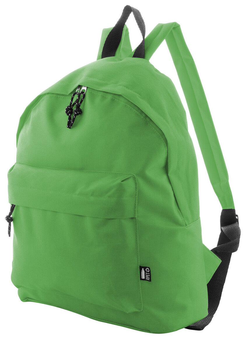 RPET batoh s hlavním prostorem na zip, přední kapsou na zip, polstrovanými zády a ramenními popruhy. Polyester 600D RPET, s výrazným štítkem RPET.