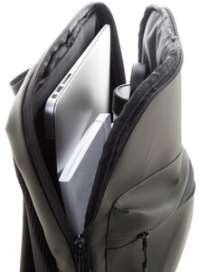 Vodotěsný tenký batoh na notebook RPET s přihrádkou na notebook (15") na zip a přední kapsou na zip. S polstrovanými zády a ramenními popruhy. Polyester 600D RPET potažený PU, s výrazným štítkem RPET.
