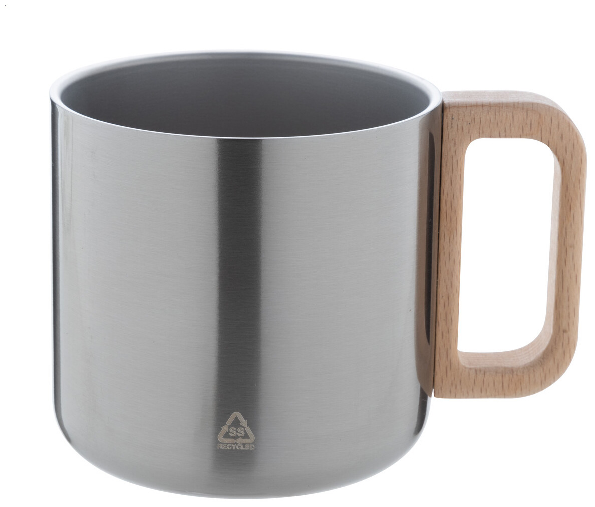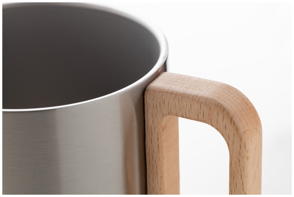 Dvoustěnný termo hrnek z recyklované nerezové oceli s dřevěným uchem. 350 ml.