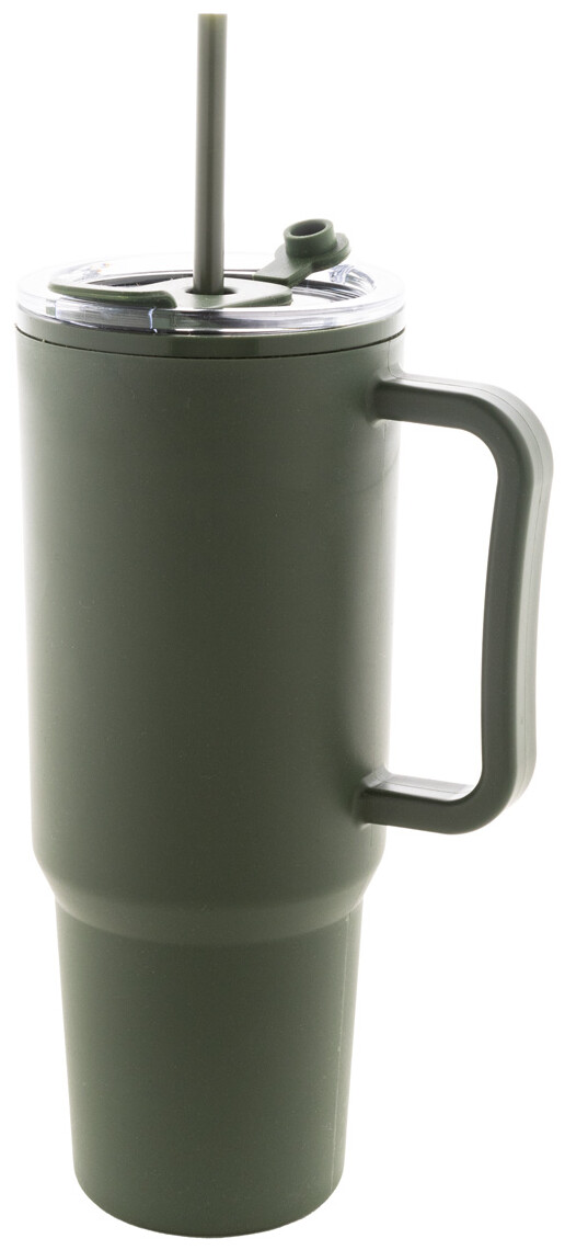Dvoustěnný termo hrnek izolovaný PP plastem s víčkem na pití a brčkem. 1100 ml.
