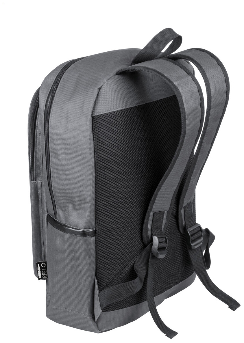 Batoh RPET s hlavním oddílem na zip, 2 předními kapsami na zip, bočními kapsami a polstrovanou přihrádkou na notebook (15"). S polstrovanými zády a ramenními popruhy. Polyester 600D RPET, s výrazným štítkem RPET.
