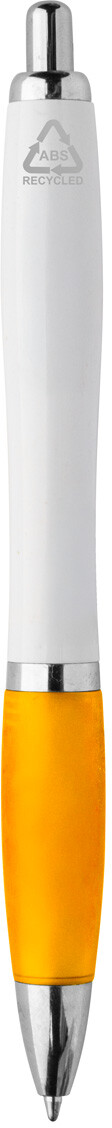 Kuličkové pero z recyklovaného ABS plastu s bílým tělem, barevným úchopem a chromovanými částmi. S modrou náplní.