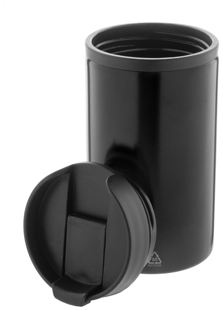 Dvoustěnný izolovaný termo hrnek z recyklované nerezové oceli s PP plastem uvnitř a víčkem na pití. 250 ml.
