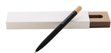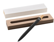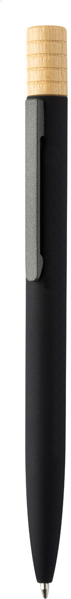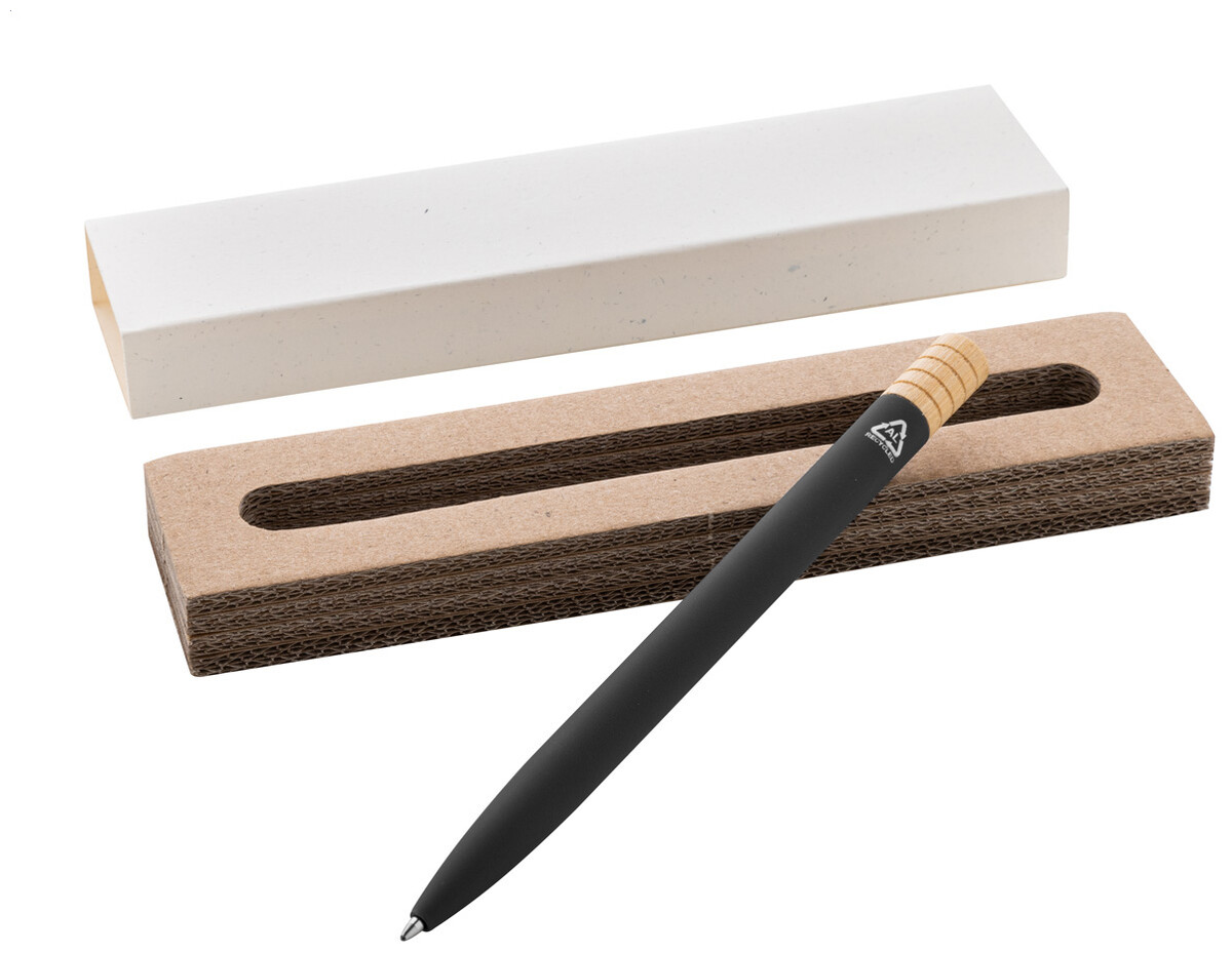 Kuličkové pero z recyklovaného hliníku s kovovým klipem a bambusovým vrškem. S modrou náplní. V kraftové papírové krabičce.