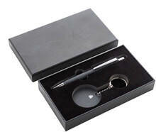 2dílná dárková sada v černé papírové dárkové krabičce. Včetně kuličkového pera z recyklovaného hliníku s pogumovaným povrchem a modrou náplní a přívěsku na klíče z recyklované nerezové oceli s pogumovaným povrchem. Obě položky mají speciální povrchovou úpravu pro zrcadlové laserové gravírování.