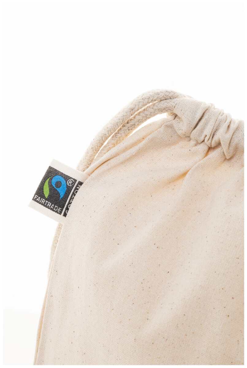 Fairtrade bavlněný vak se stahovací šňůrkou s výraznou Fairtrade etiketou. 100% Fairtrade bavlna, 180 g/m2.