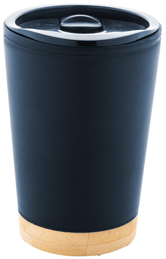 Dvoustěnný termo hrnek izolovaný PP plastem s víčkem na pití a bambusovým dnem, 260 ml.