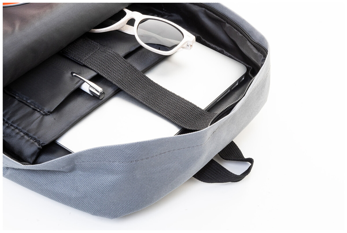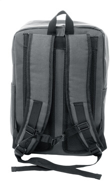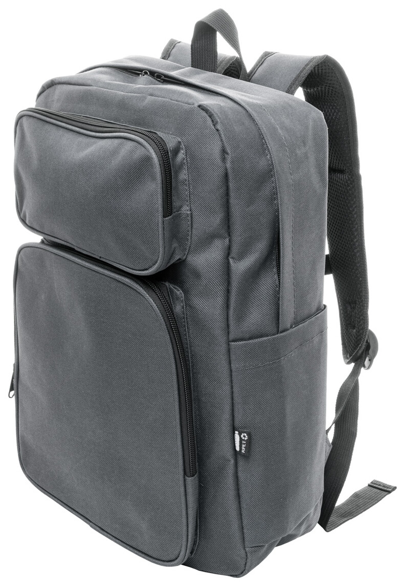 Batoh RPET s hlavním oddílem na zip, 2 předními kapsami na zip, bočními kapsami a polstrovanou přihrádkou na notebook (15") a tablet (10") S polstrovanými zády a ramenními popruhy. Polyester 600D RPET, s výrazným štítkem RPET.