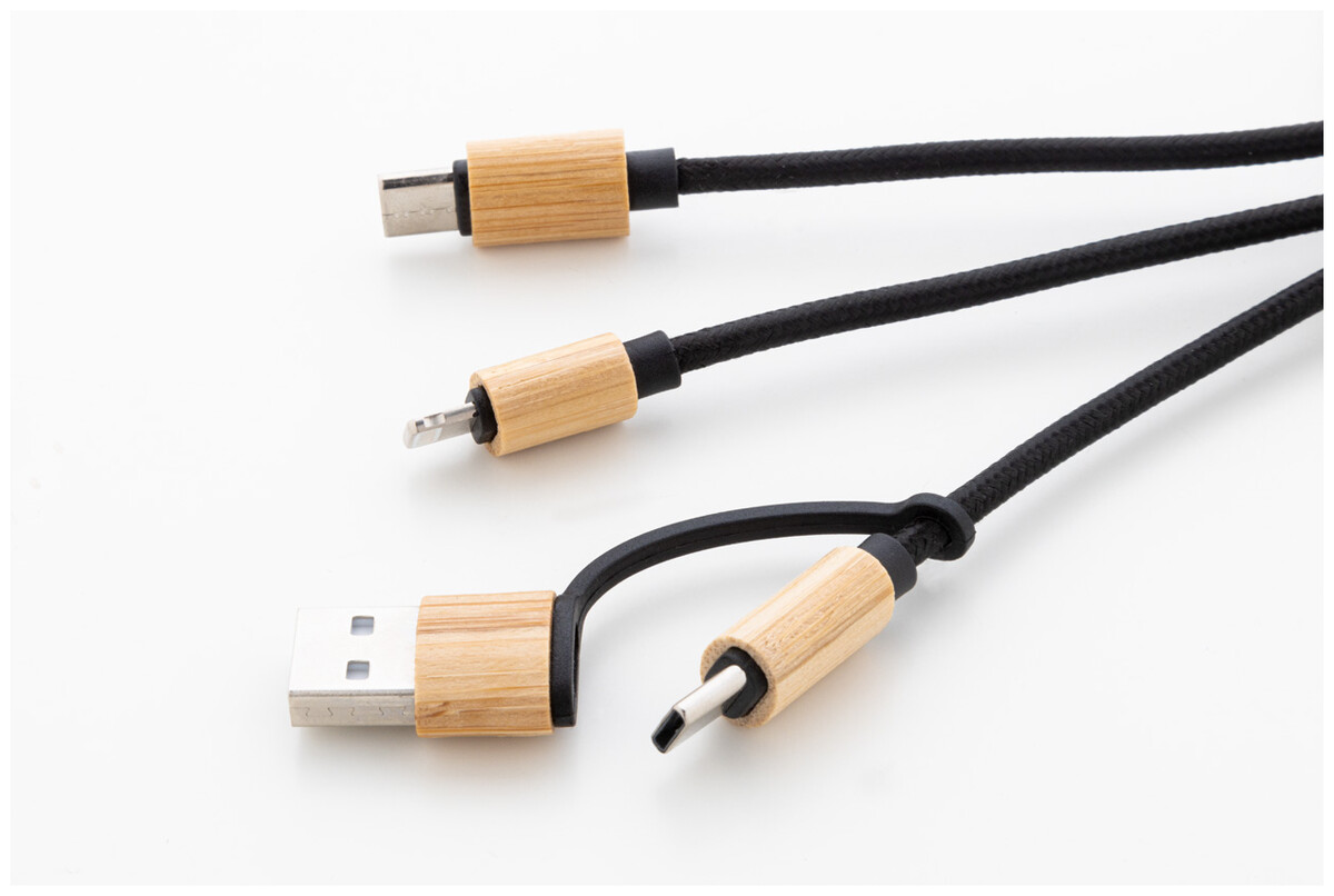 RPET a bambusový USB nabíjecí kabel s kroužkem na klíče. S konektory micro USB, USB-C a Lightning. Se vstupy USB a USB-C.