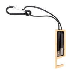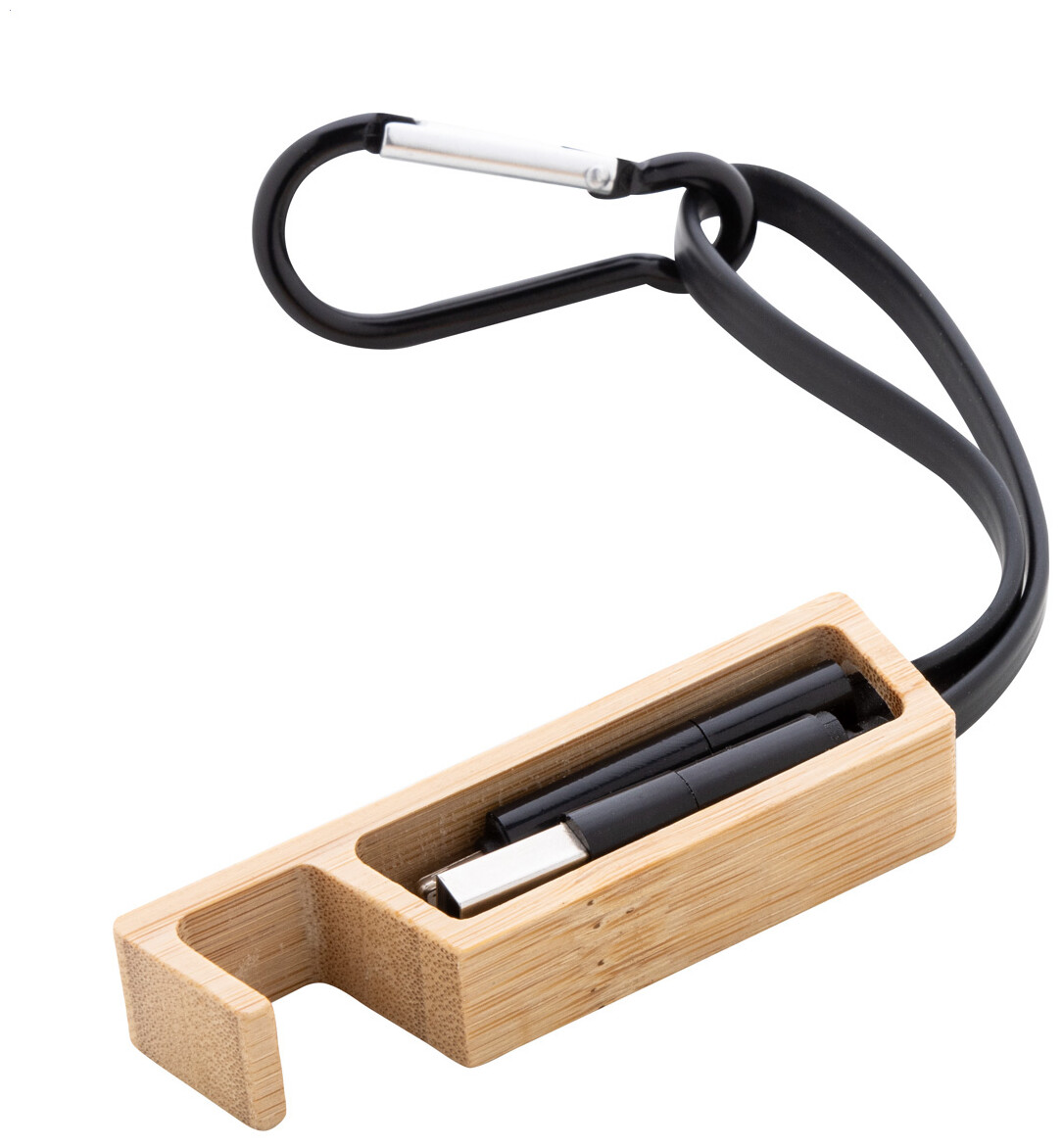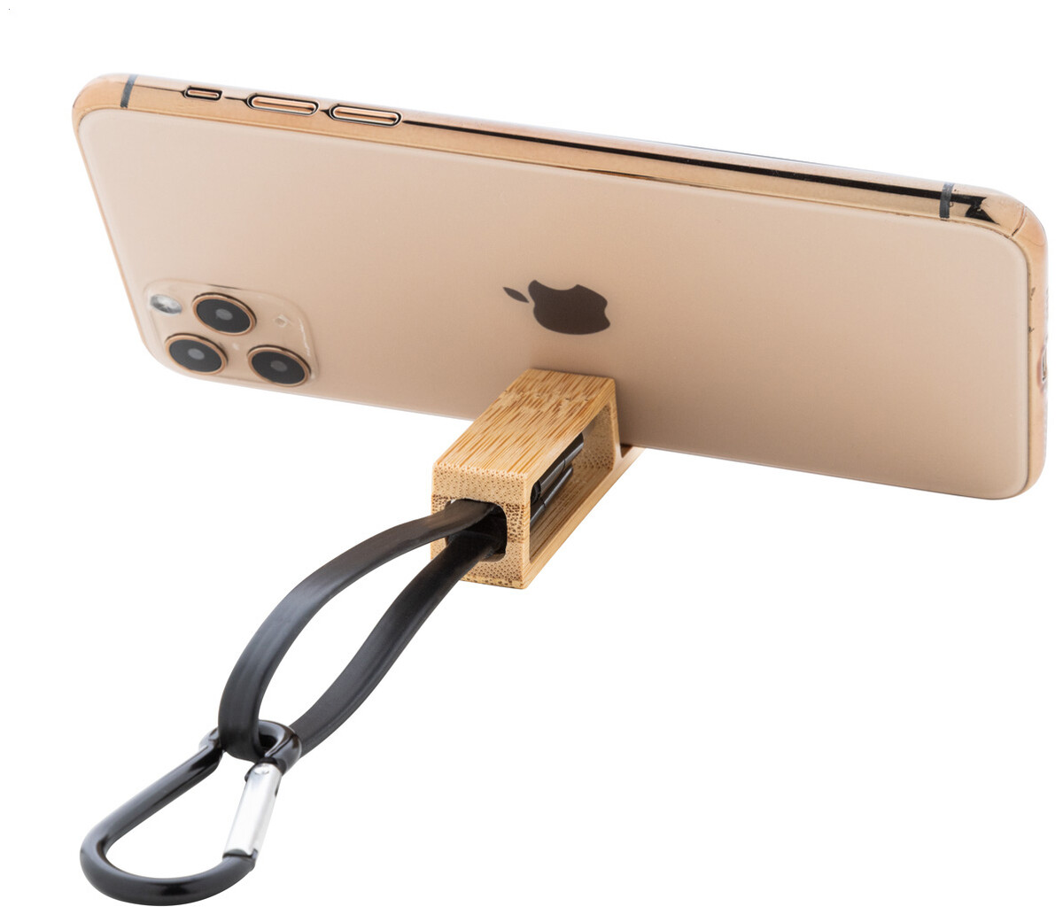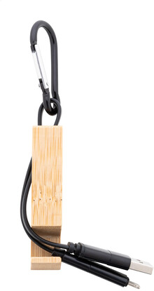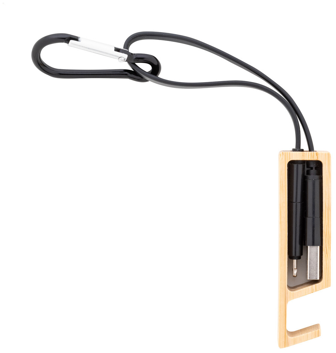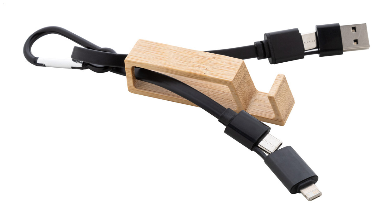 USB nabíjecí kabel s karabinou z recyklovaného hliníku a bambusovým držákem na mobil. S konektory micro USB, USB-C a Lightning. Se vstupy USB a USB-C.