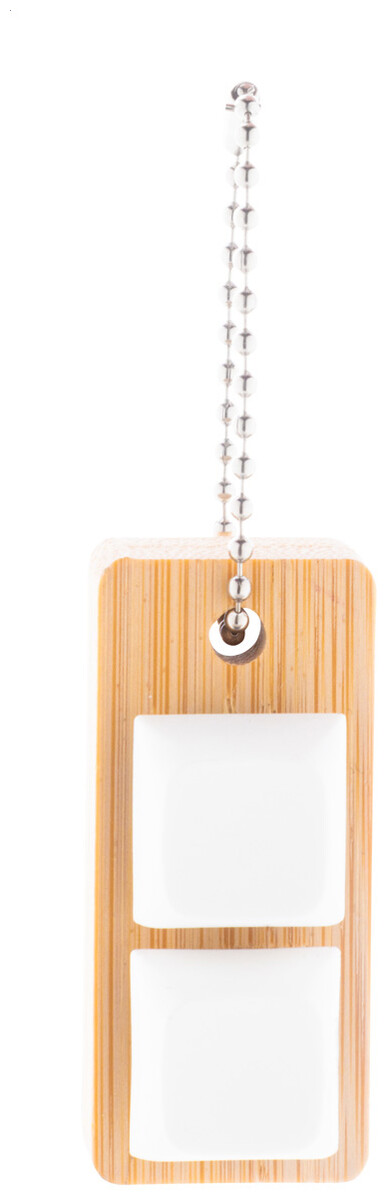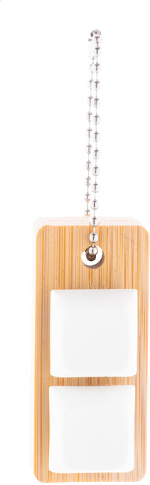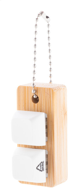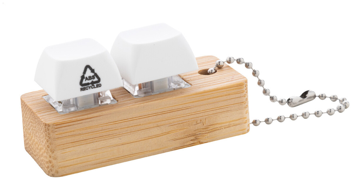 Bambusový přívěsek na klíče s kovovým řetízkem a 2 recyklovanými ABS antistresovými tlačítky imitujícími mechanická tlačítka klávesnice.