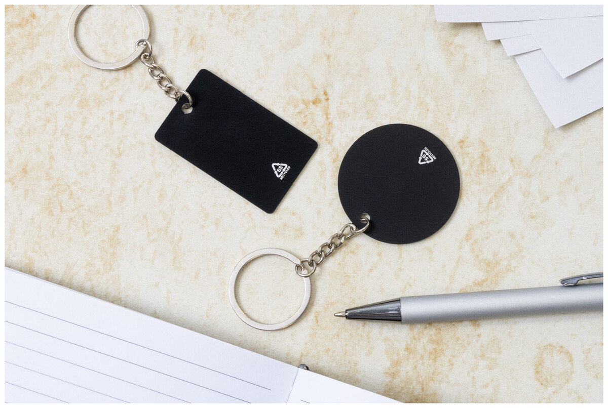 Kulatý přívěsek na klíče z recyklované nerezové oceli s pogumovaným povrchem. Se speciální vrstvou pro zrcadlové laserové gravírování.