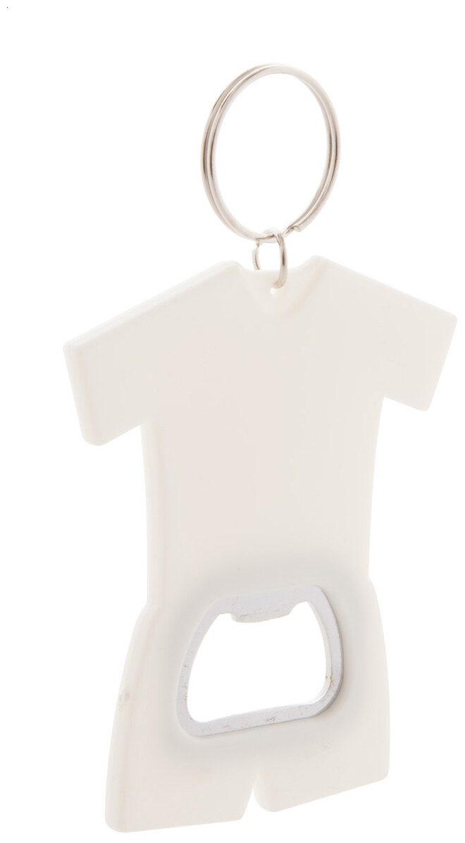 Otvírák na láhve z recyklovaného ABS plastu ve tvaru sportovního dresu s kovovým kroužkem na klíče.