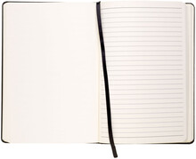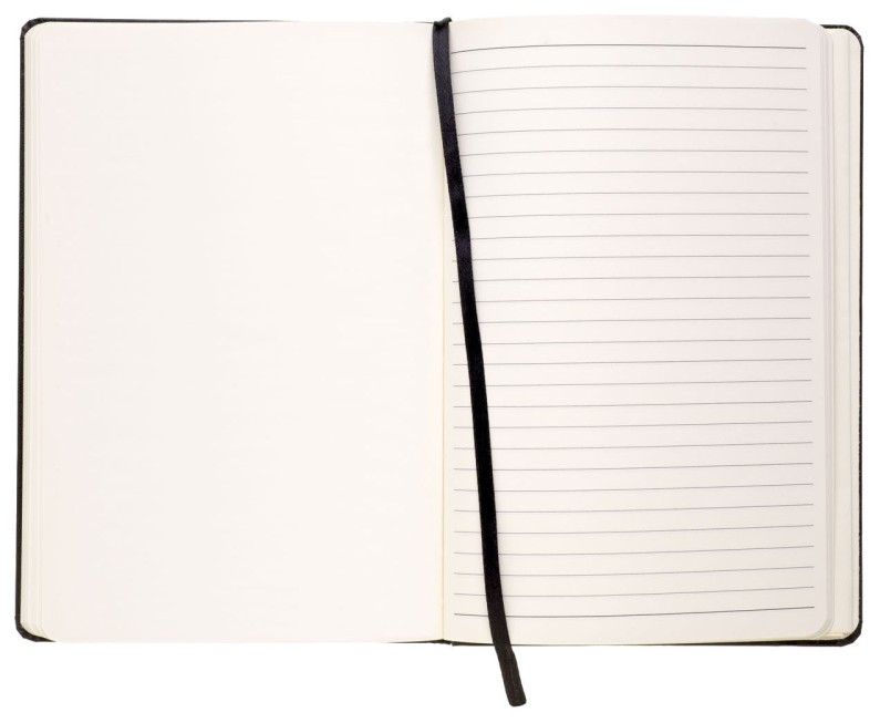 Zápisník RECORD A5 v černých deskách má 80 listů, vpravo linkovaného, vlevo čistého papíru v barvě slonové kosti. Blok má uzavírací gumičku a textilní záložku v barvě desek, na vnitřních zadních deskách vlepenou papírovou kapsu na poznámky.