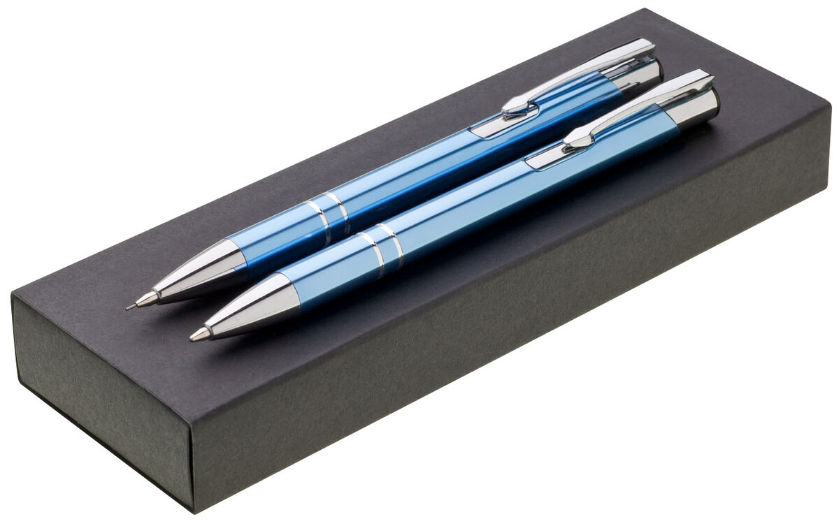 Sada ORIN světle modrá, tužky jsou vyrobeny z hliníku, na těle mají 2 stříbrné proužky a doplňky. Dodávají se v papírové krabičce.