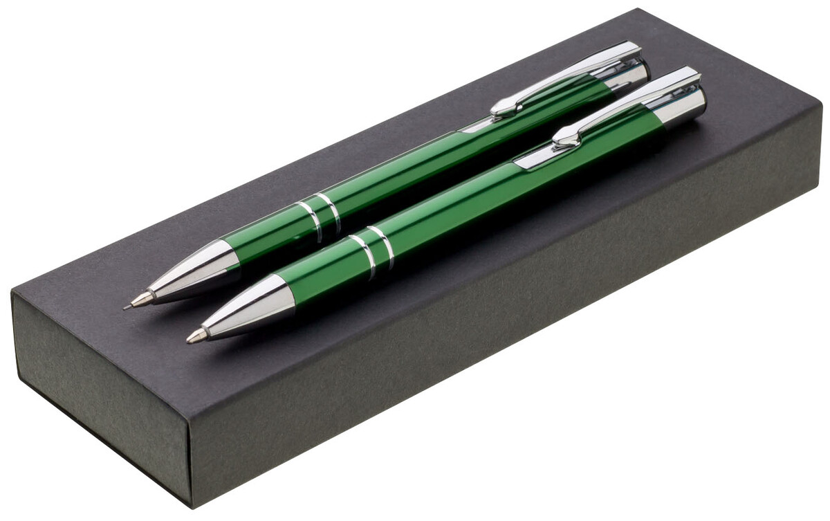 Sada ORIN zelená, tužky jsou vyrobeny z hliníku, na těle mají 2 stříbrné proužky a doplňky. Dodávají se v papírové krabičce.