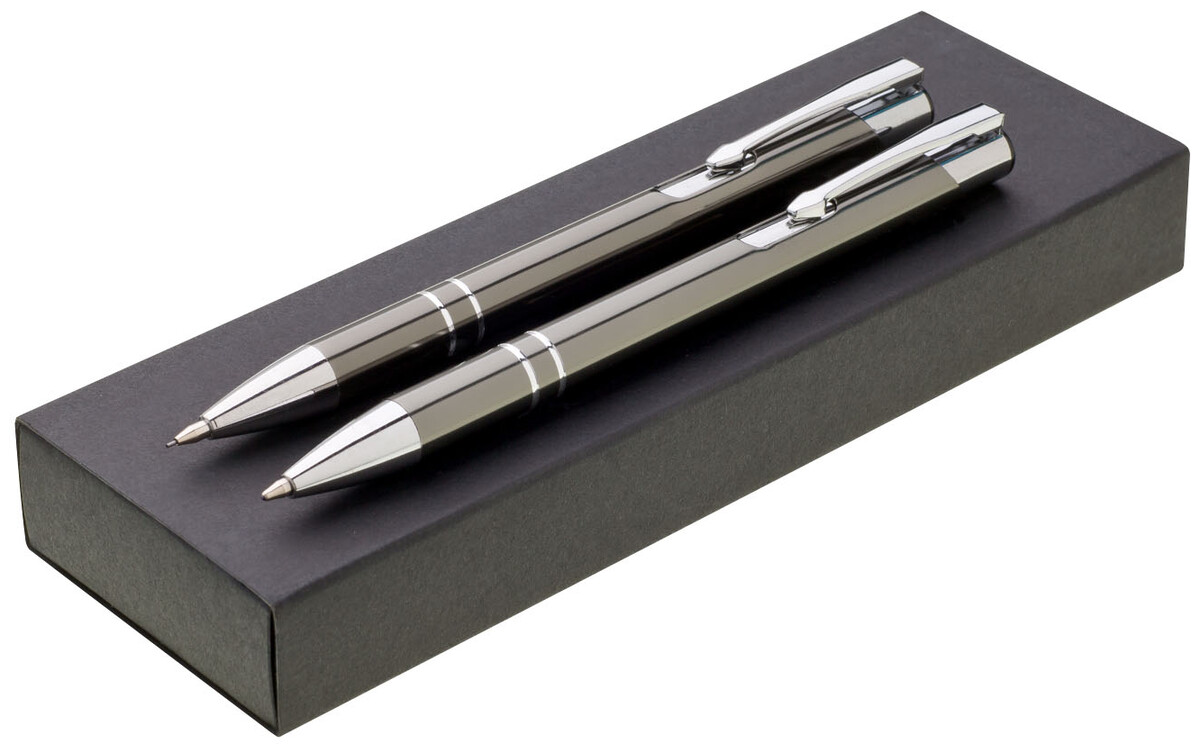 Sada ORIN šedá, tužky jsou vyrobeny z hliníku, na těle mají 2 stříbrné proužky a doplňky. Dodávají se v papírové krabičce.