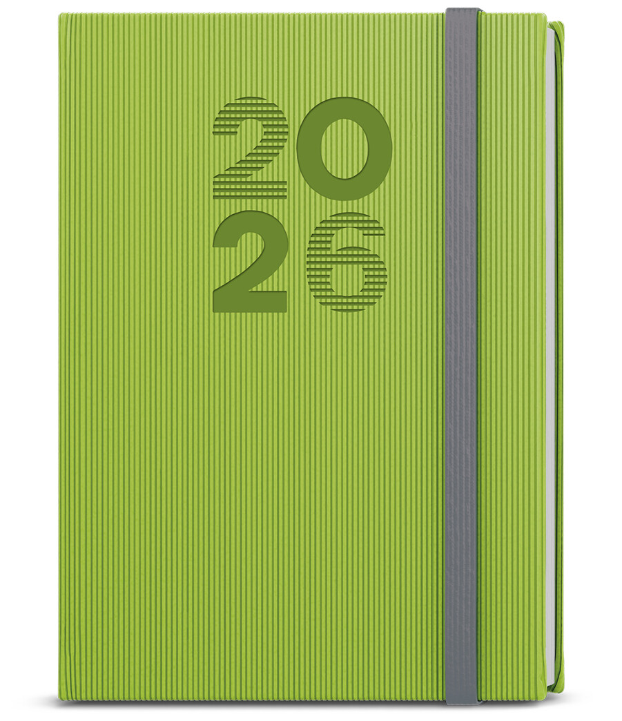 Týdenní diář formátu A5 vyrobený ze strukturovaného materiálu v zelené barvě a s gumičkou. Oblíbená grafika vnitřního bloku Vám pomůže účelně plánovat Vaše dny.